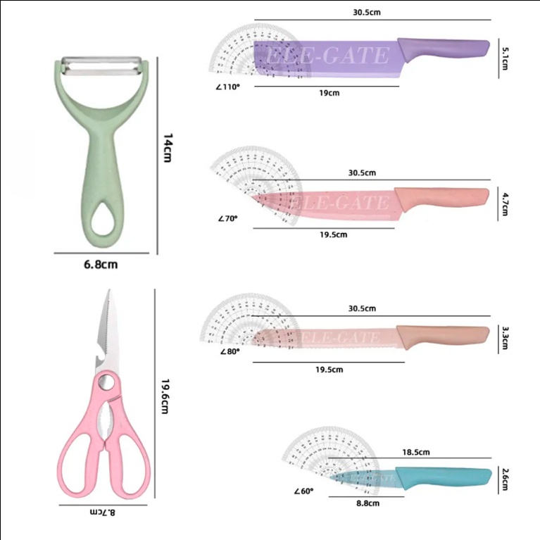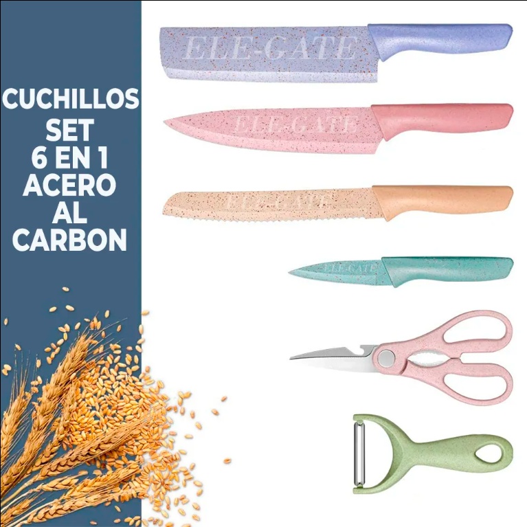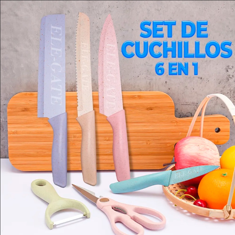 • [ Juegos de cuchillos de cocina coloridos de 6 piezas ]El juego de cuchillos de chef con caja de regalo incluye un cuchillo de chef de 8″, un cuchillo de carnicero de 8″, un cuchillo de cocina de 8″ … Cuchillo de pan de 8″, un cuchillo de cocina de 3.5″, un pelador de 6″ y tijeras