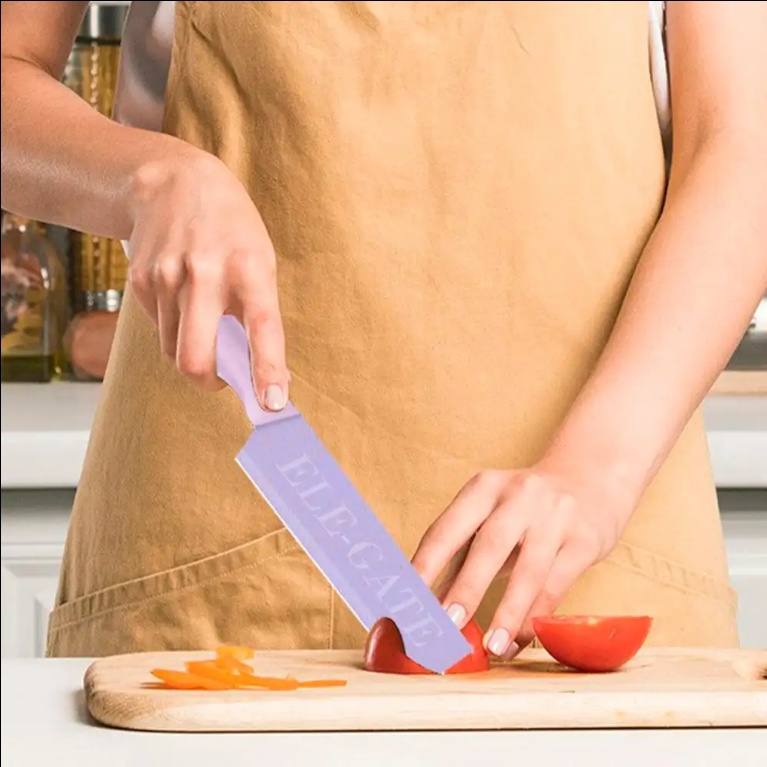• Cada  hoja de  los coloridos cuchillos de cocina está hecha de acero inoxidable con alto contenido de carbono, lo que la hace afilada, resistente y duradera durante un largo período. El recubrimiento antiadherente de paja de trigo es de grado alimenticio y antioxidante, lo que ayuda a aumentar la resistencia al desgaste de la superficie de la hoja y aumentar la eficiencia de corte.